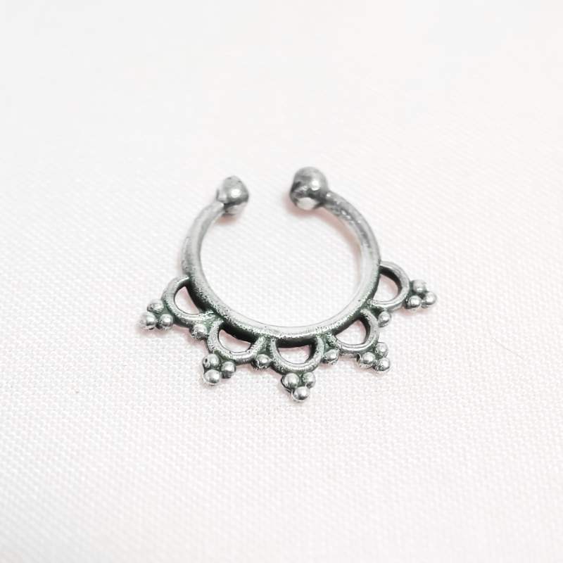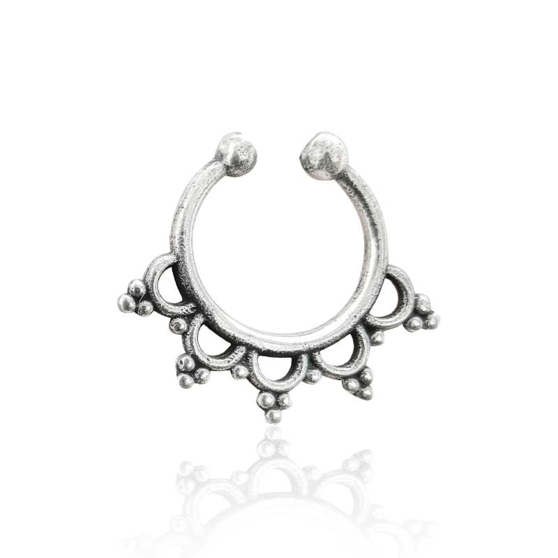Add a touch of edgy elegance with our Clip-On Septum Nose Ring, crafted in sterling silver. Designed for comfort and style, it offers a trendy look without the need for a piercing. Perfect for bold, statement-making accessorizing.