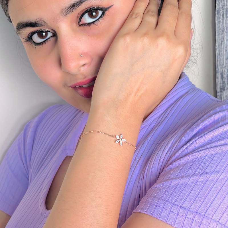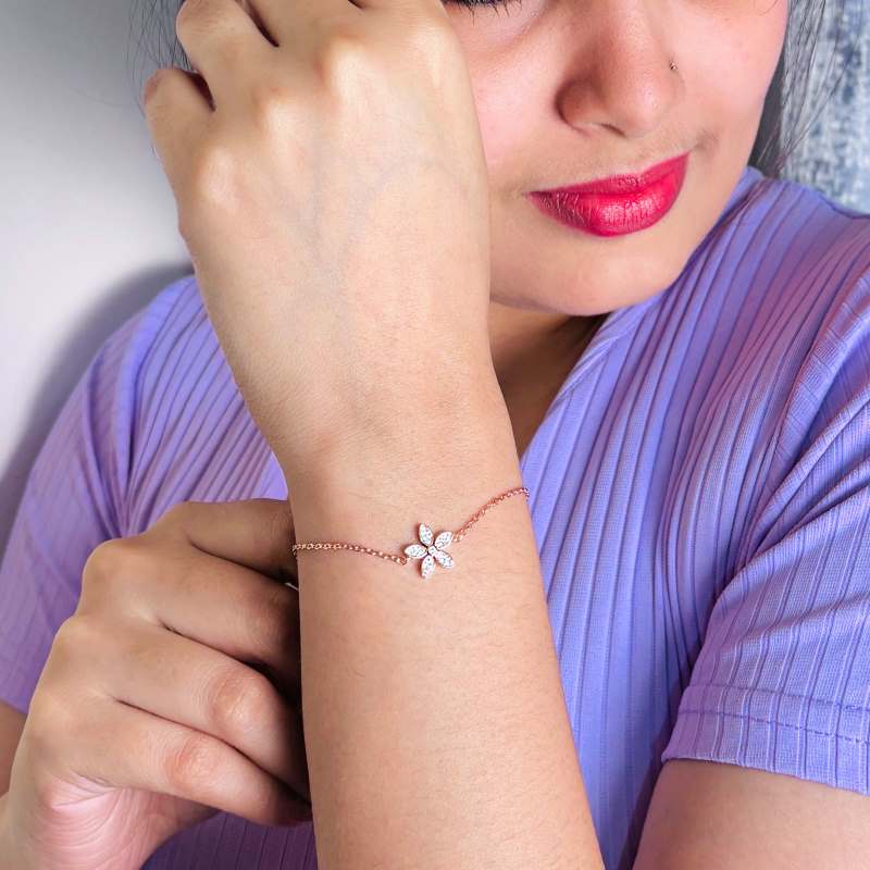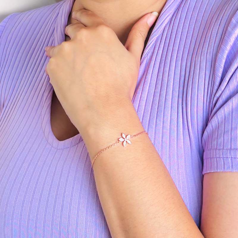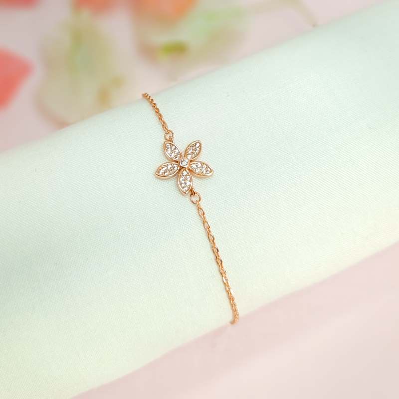 Add a touch of floral elegance to your look with this exquisite bracelet, featuring a dazzling flower design adorned with shimmering white stones on a radiant rose gold chain. Perfect for everyday charm or a special gift!