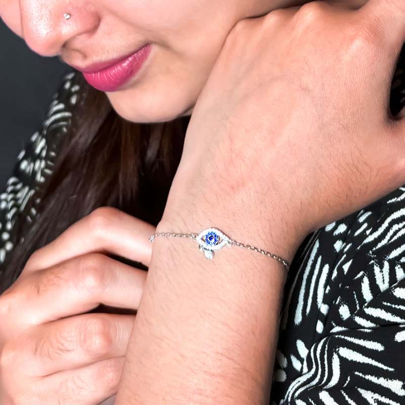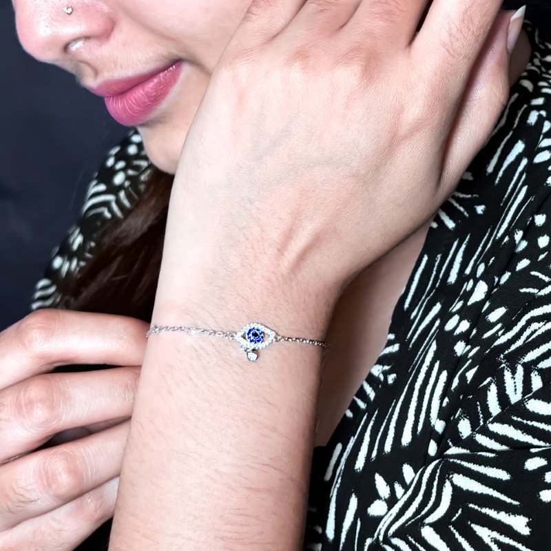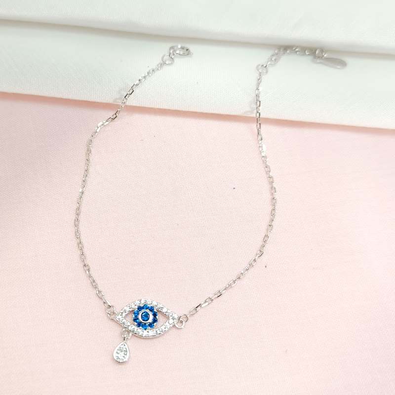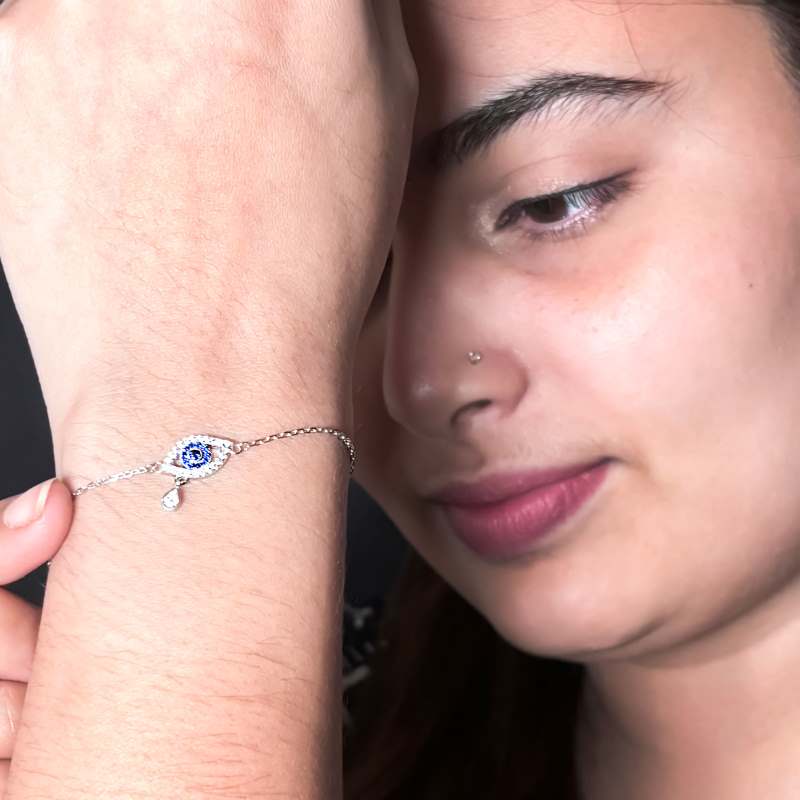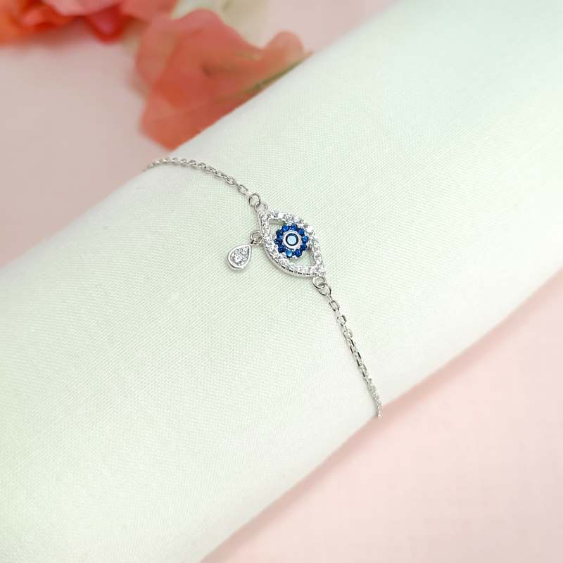 A symbol of protection and style, this elegant bracelet features a dazzling evil eye design with blue and white stones, accented by a delicate teardrop charm. Crafted in sterling silver, it’s perfect for everyday wear or as a meaningful gift.