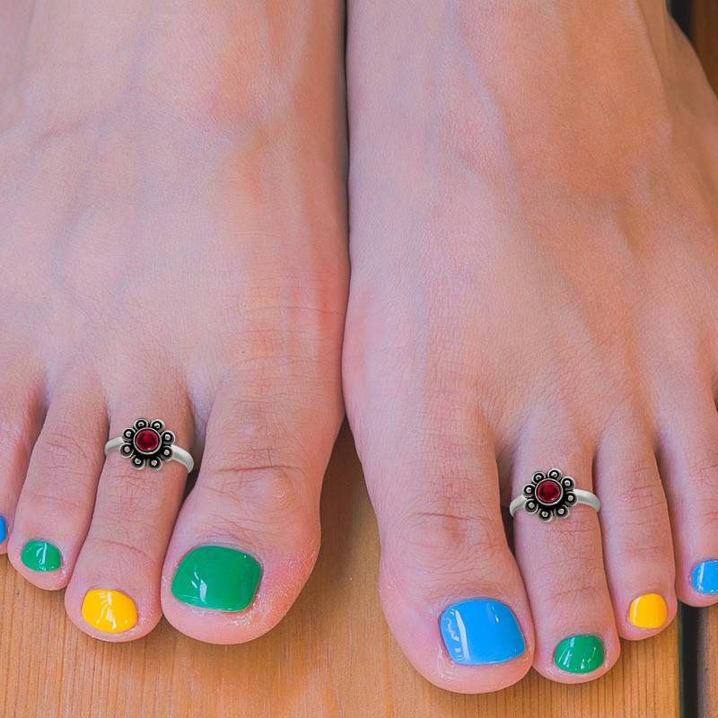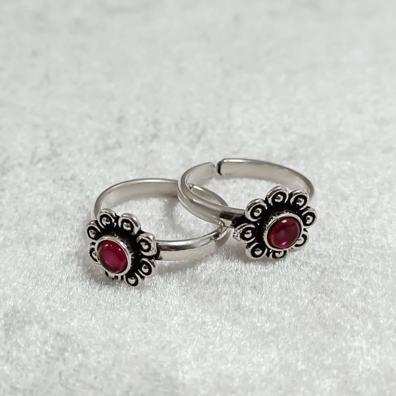 Floral Silver Toe Rings- Red