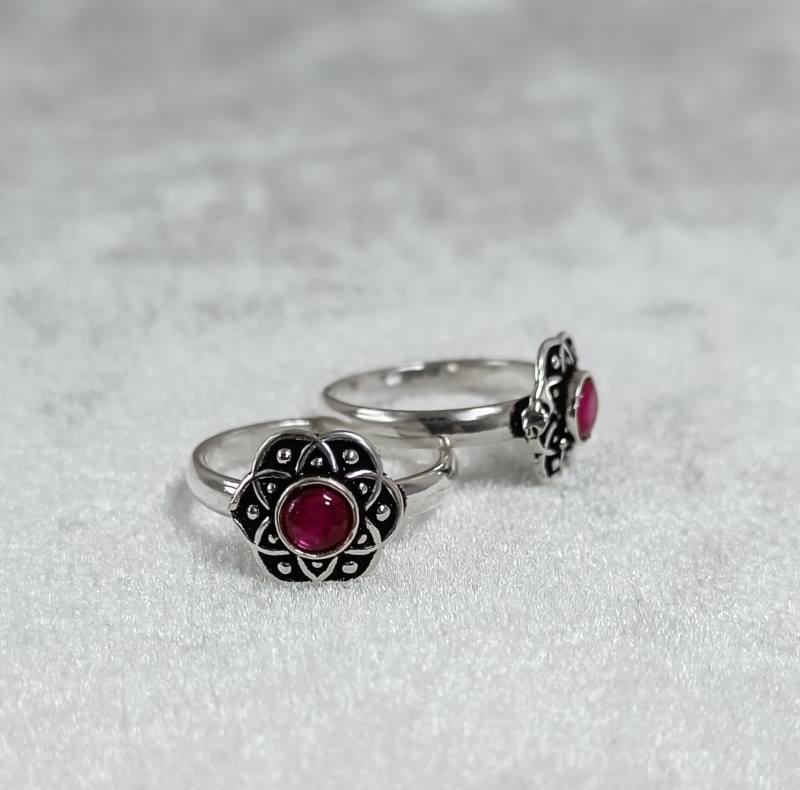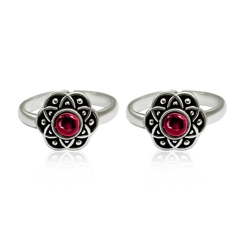 Silver Blossom Toe Rings- Red