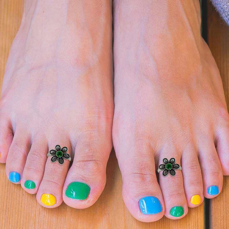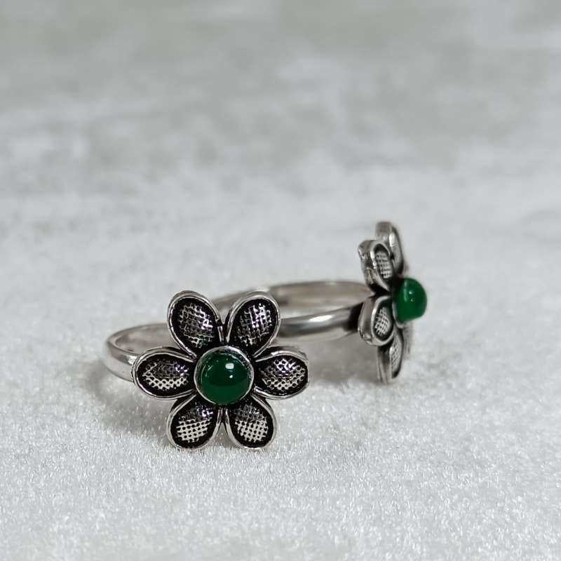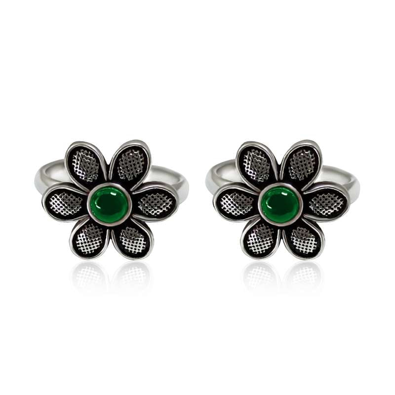 Silver Flower Toe Rings- Green