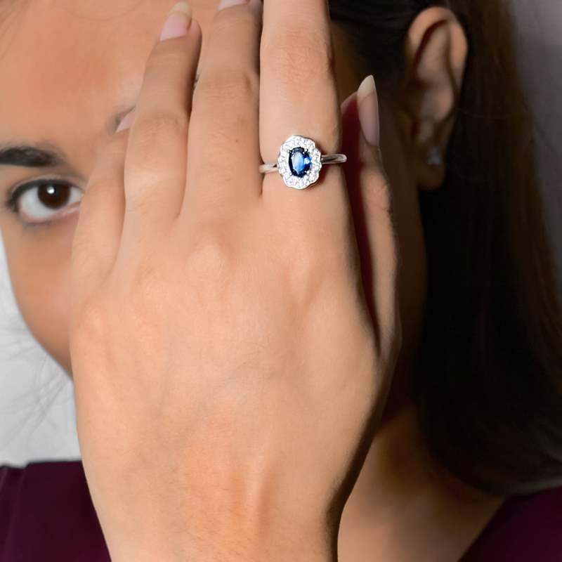 Crafted in 925 sterling silver, this exquisite Oval Sapphire Engagement Ring features a stunning deep-blue sapphire like stone at its center, surrounded with a row of small round zircons, beautifully complemented by a luxurious Rhodium plating. The elegant oval design adds a timeless charm, making it a perfect symbol of everlasting love. Ideal for engagements, anniversaries, or any special occasion, this ring combines elegance with modern sophistication.