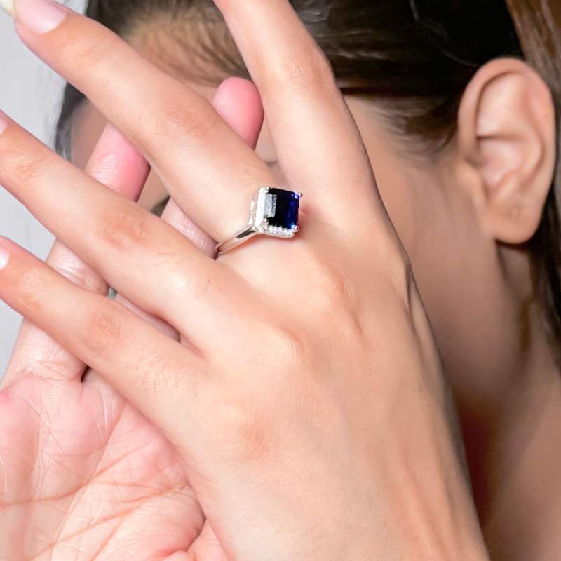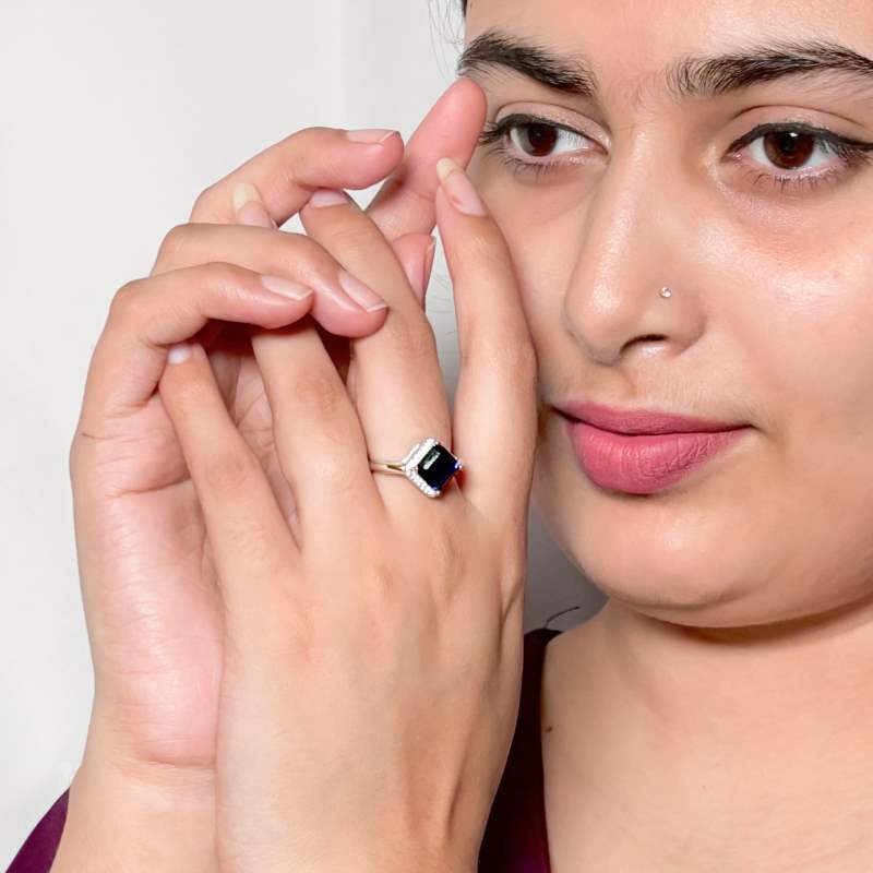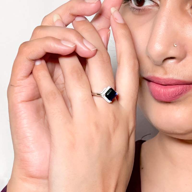 This stunning Square Sapphire Engagement Ring, made from 925 sterling silver and plated with rhodium for lasting shine, features a deep blue square-cut sapphire like stone as the centerpiece. Encircled by sparkling small round zircons, the ring exudes elegance and sophistication. The rhodium plating enhances its brilliance, making it a perfect choice for engagements or cherished moments.