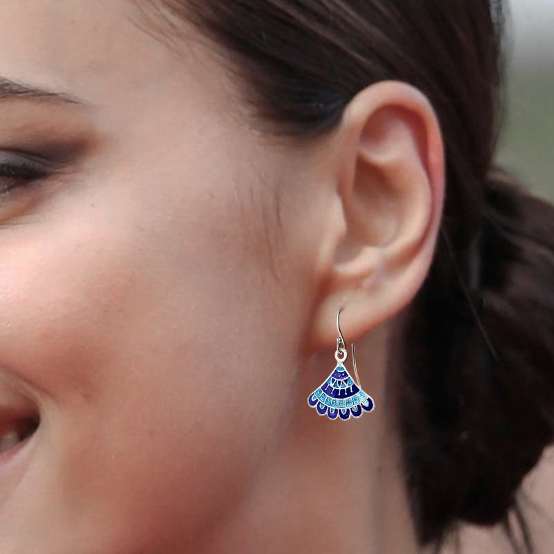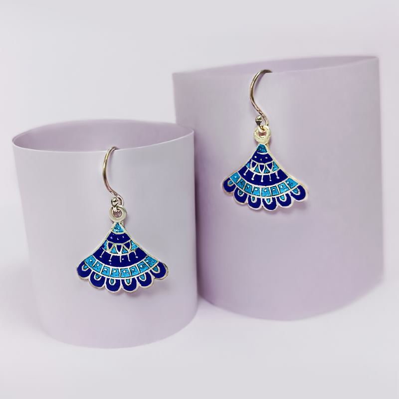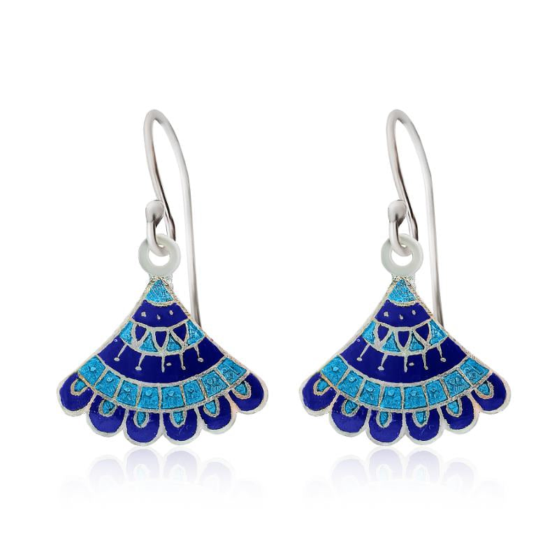 Fan Shaped drop Earrings with Enamel Meena- Blue