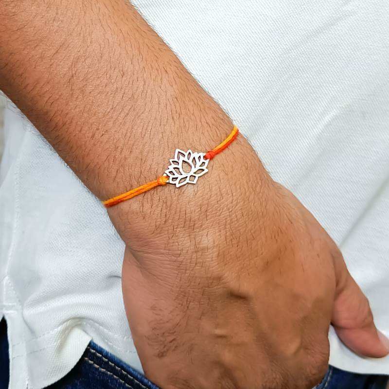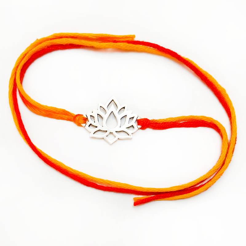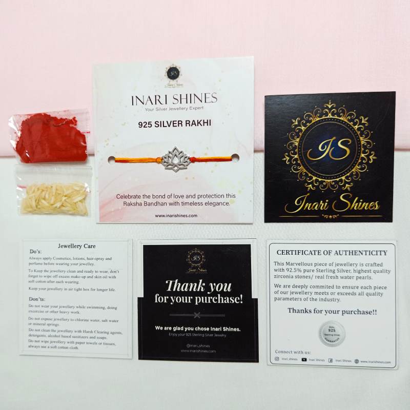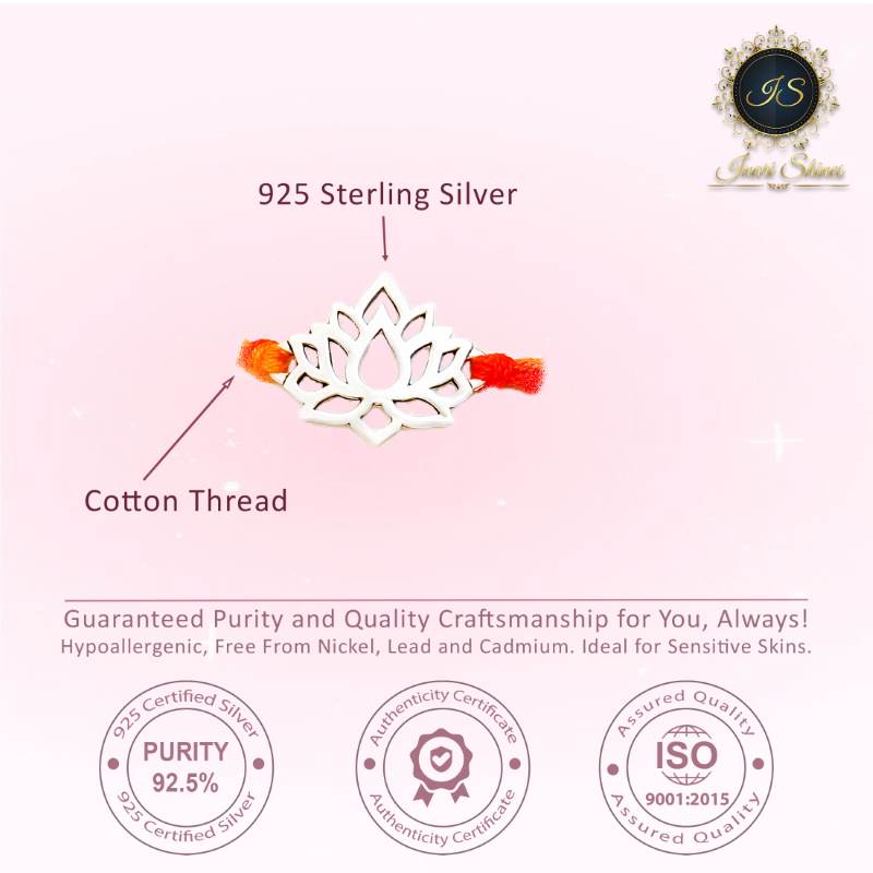 Embrace the beauty of tradition with our oxidised sterling silver Lotus Rakhi. Intricately designed and crafted for elegance, it symbolizes purity and renewal, perfect for celebrating the bond of love and protection on Raksha Bandhan with timeless sophistication.