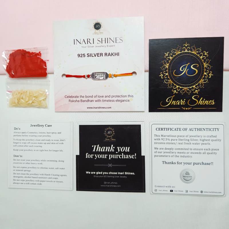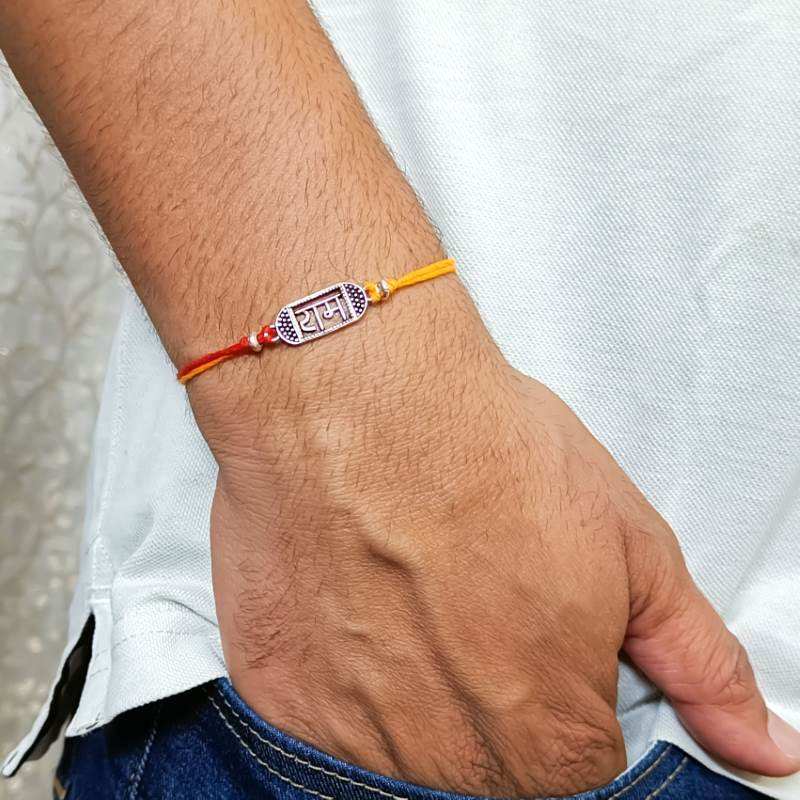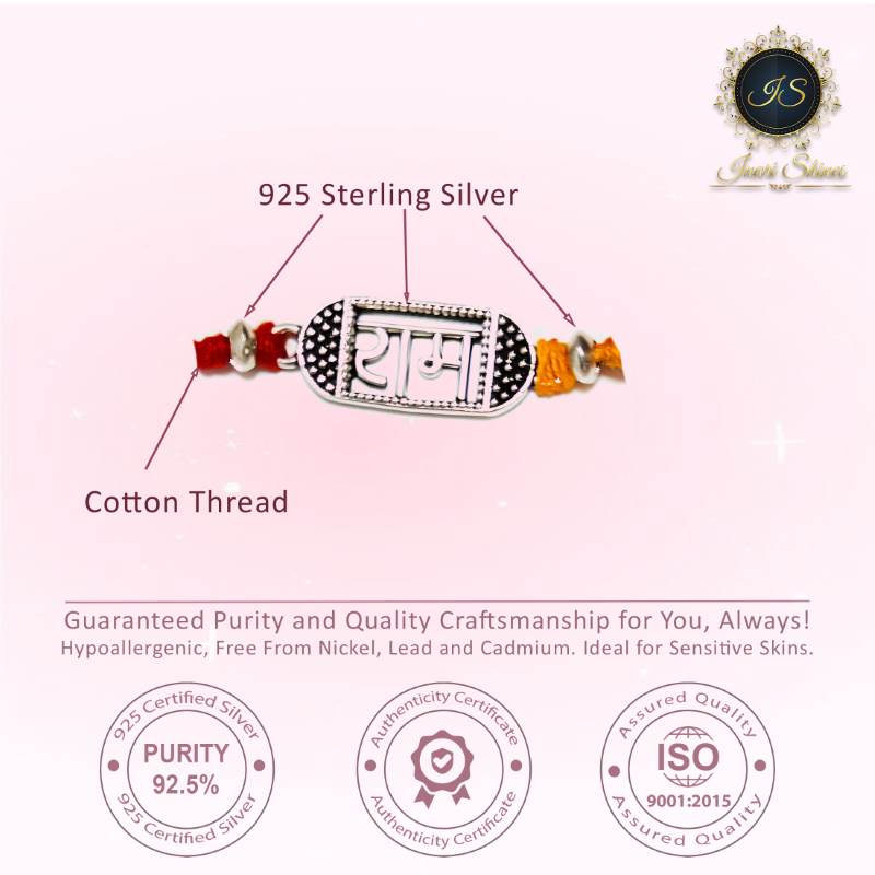 Celebrate Raksha Bandhan with timeless elegance using our oxidized sterling silver Ram Blessings Rakhi. This exquisitely crafted piece blends intricate design with enduring quality, symbolizing protection and devotion. Perfect for honoring the bond between siblings with a touch of tradition and sophistication.