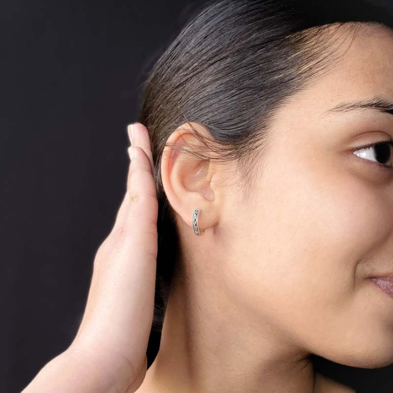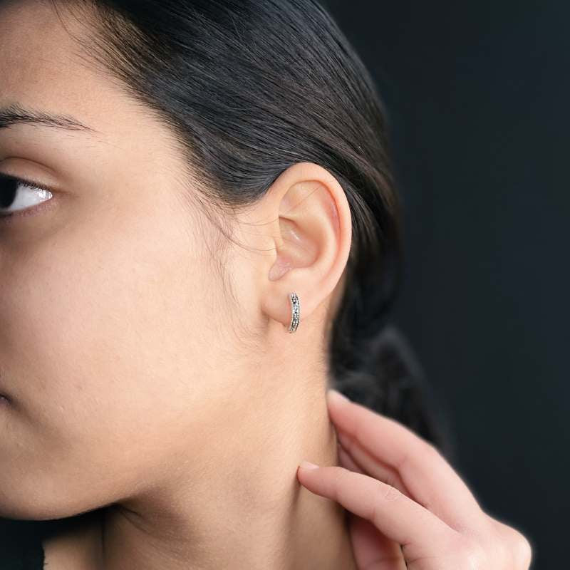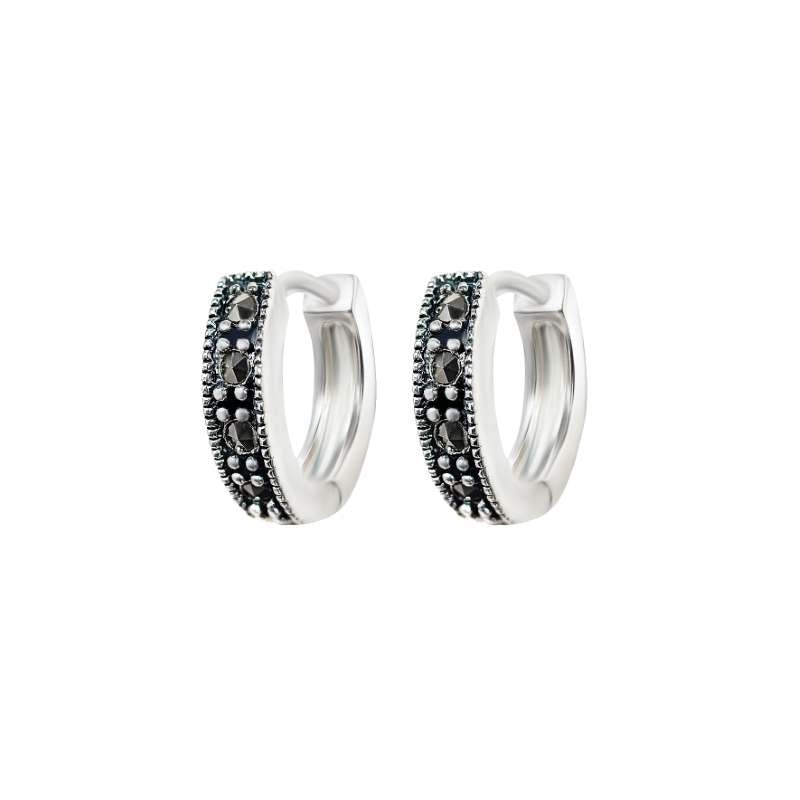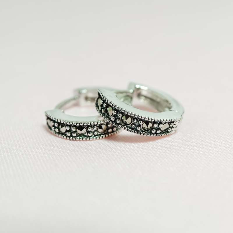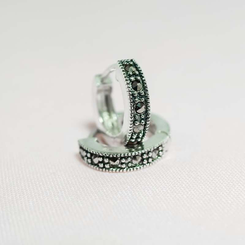 Introducing our timeless Classic Marcasite Hoops, meticulously crafted from 925 silver and elegantly plated with rhodium for enduring shine. These hoops feature a classic design adorned with shimmering marcasite stones, exuding understated elegance and sophistication. Perfect for adding a touch of vintage charm to any ensemble, these earrings are versatile for both casual and formal occasions.