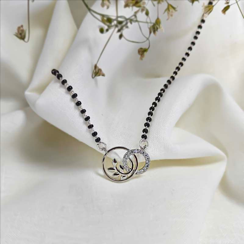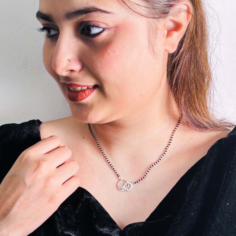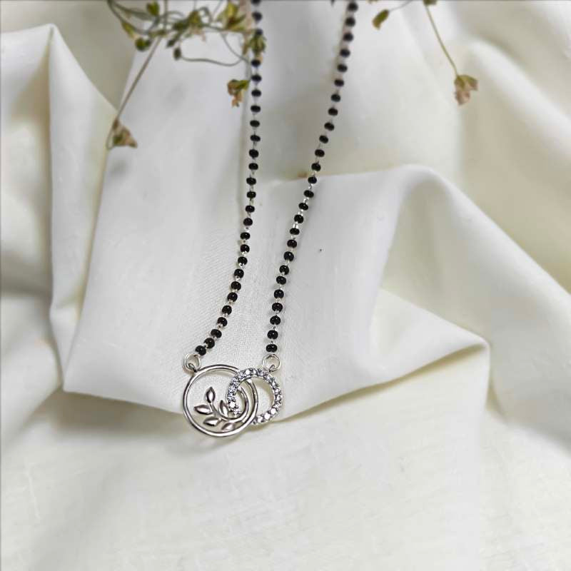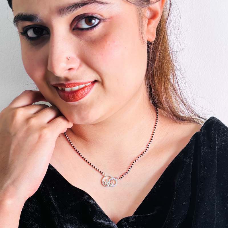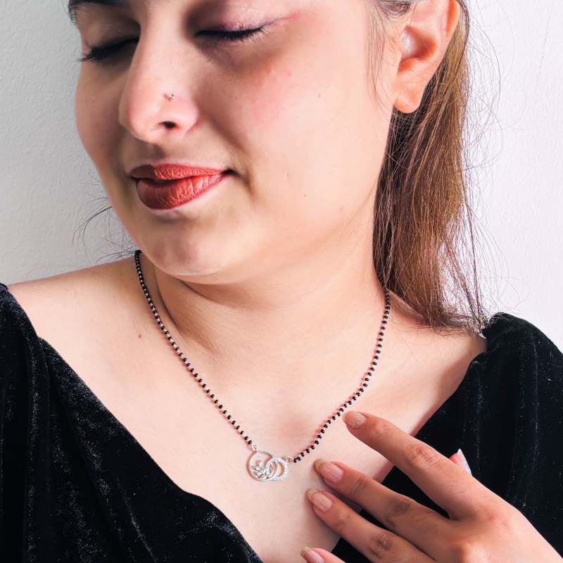 Celebrate the bond of love with the Eternal Harmony Silver Mangalsutra, featuring interlocking circles symbolizing unity and togetherness. Crafted in 925 sterling silver, one circle is adorned with dazzling zircons, adding a touch of elegance. The traditional black bead chain blends timeless charm with modern sophistication, making it perfect for daily wear or special occasions.