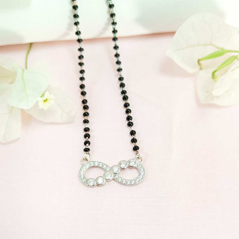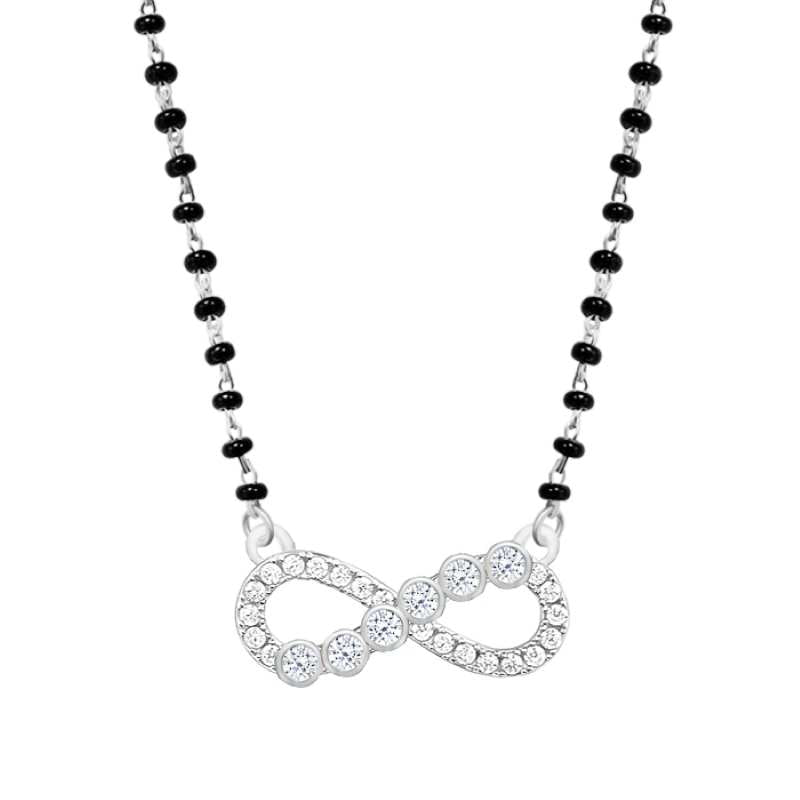 Discover the Halo Infinity Mangalsutra, meticulously crafted from 925 silver and enhanced with rhodium plating. This elegant design features an infinity symbol encircled by a dazzling halo of stones, symbolizing eternal love and brilliance. A perfect fusion of tradition and contemporary style.