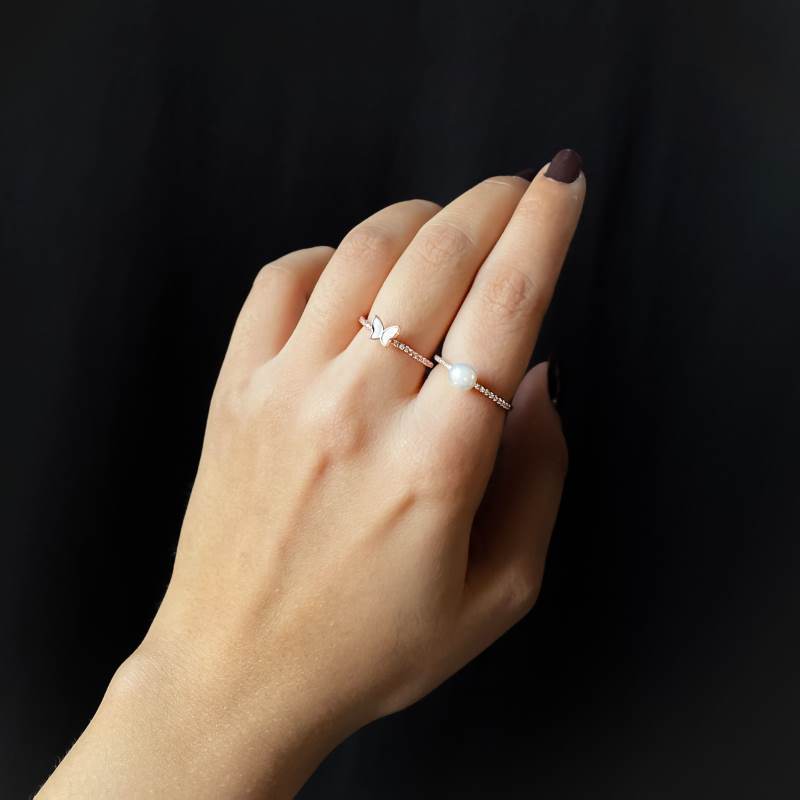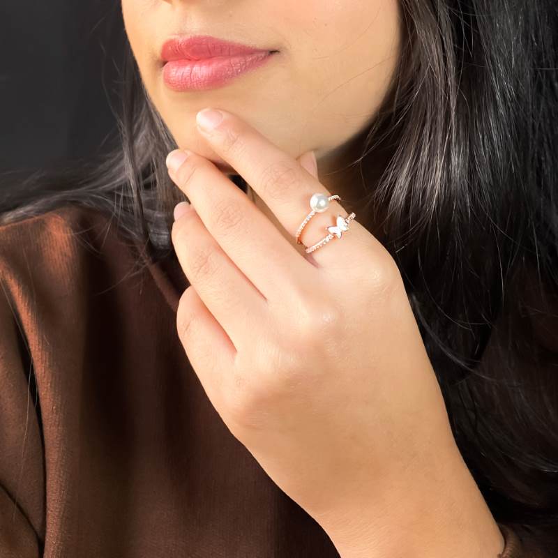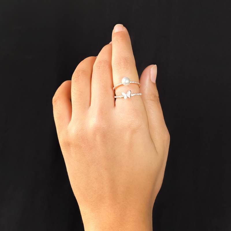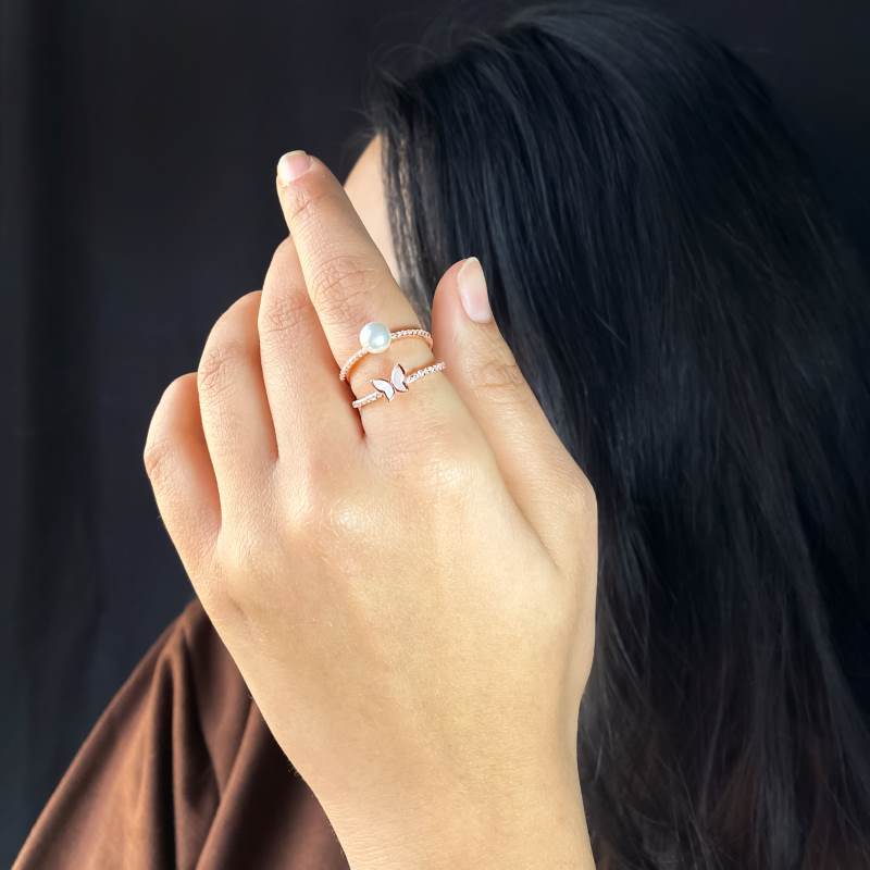 Elevate your style with our Rosegold Pearl and Butterfly Stackable Rings set. Crafted from 925 sterling silver and plated in radiant rose gold, these delicate rings feature lustrous pearls and intricate butterfly motifs. Perfect for stacking or wearing individually, they add a touch of elegance and whimsy to any ensemble, celebrating the beauty of nature and sophistication.