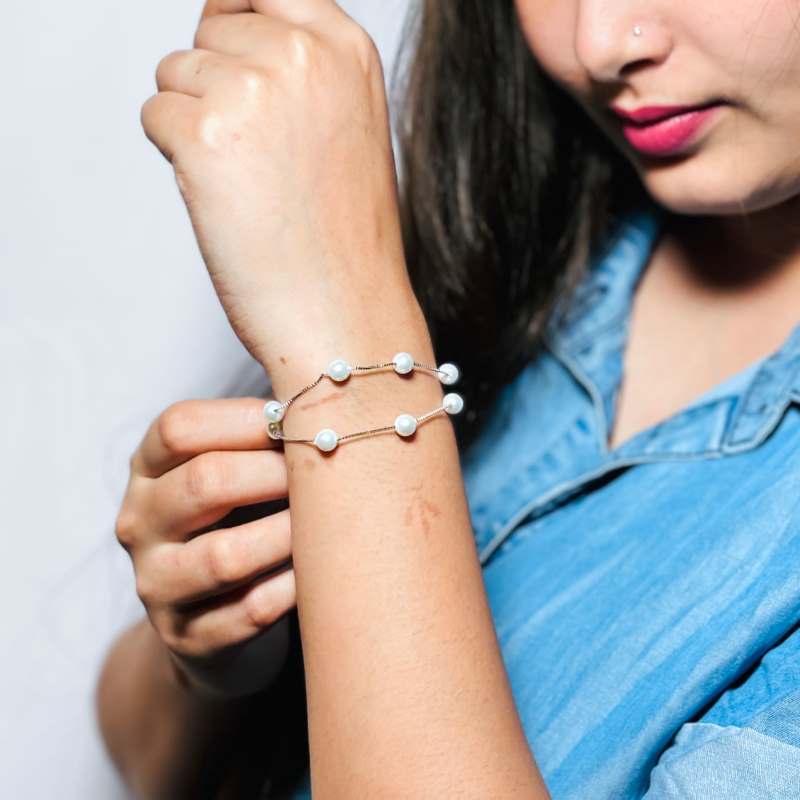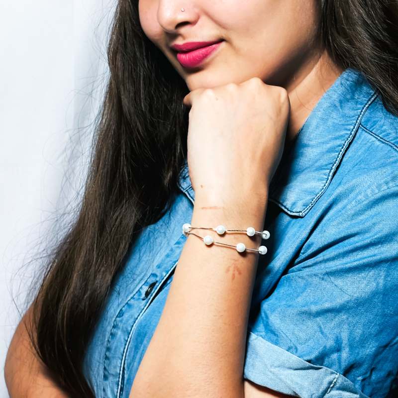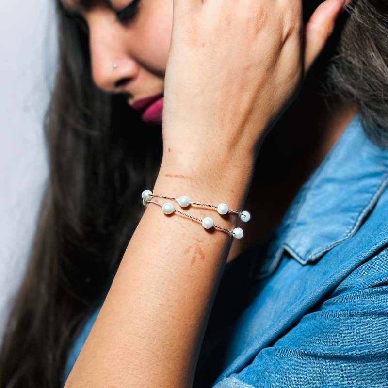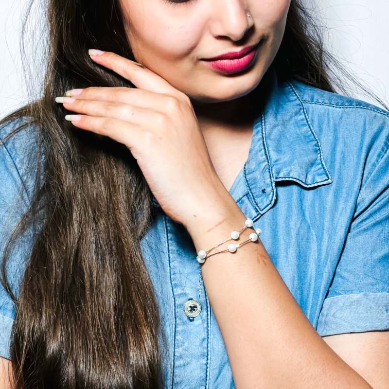 A timeless symbol of grace, this two-layered bracelet features lustrous pearls on a delicate chain, adding a touch of sophistication to any look. Perfect for special occasions or everyday elegance.