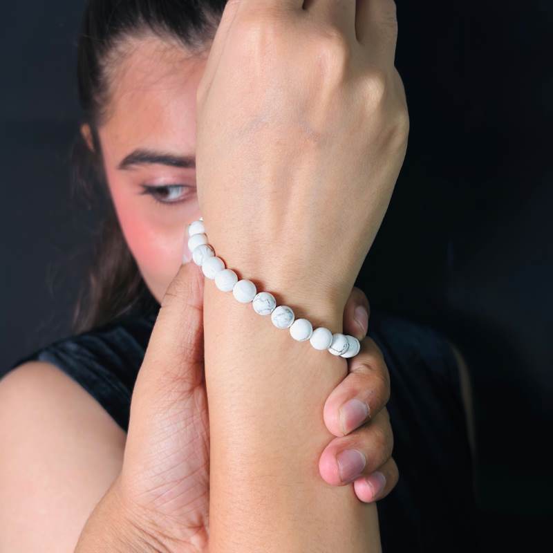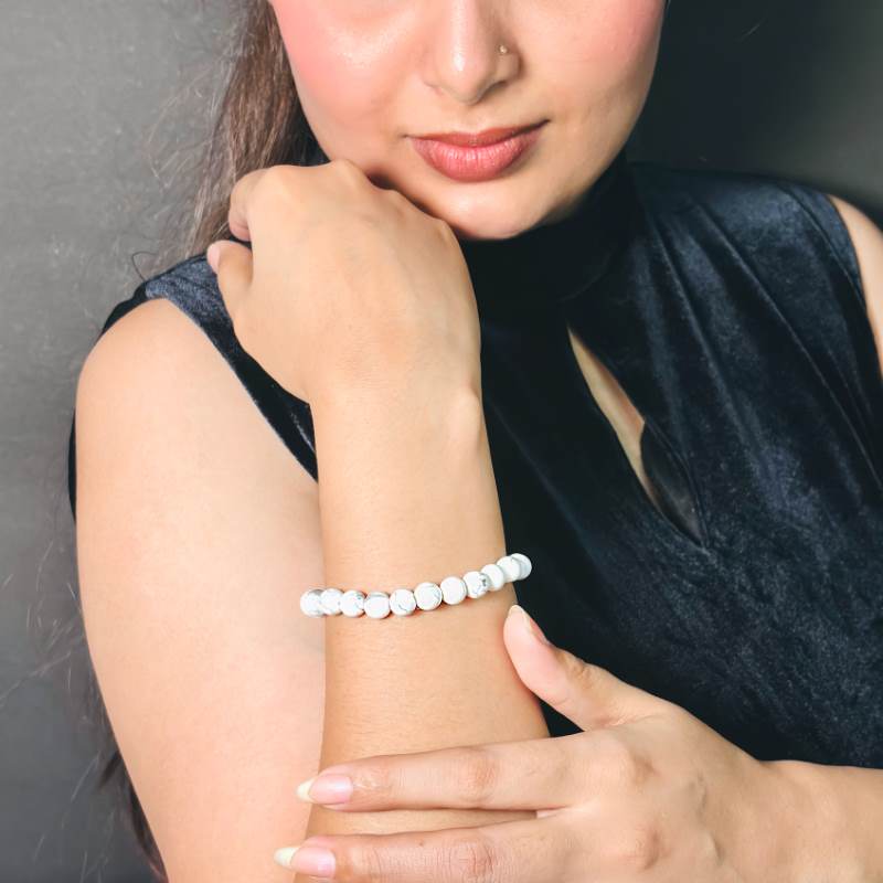 Howlite is a semi-precious stone with a marble-like appearance, composed of borate mineral. It is particularly beneficial for appeasing Venus (Shukra) and the Moon. The Howlite Bracelet is often used for spiritual purposes, aiding those affected by the positions of the Moon or Lord Shukra (Venus) in their birth chart.
