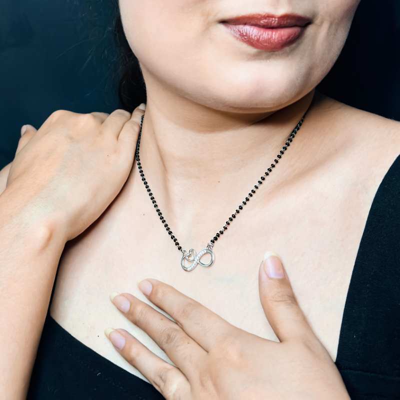 Introducing our Infinity Heart Mangalsutra, crafted with 925 sterling silver and elegantly rhodium plated. This stunning piece features a delicate black bead chain, symbolizing eternal love and commitment. Perfect for everyday wear or special occasions, it's a timeless addition to any jewelry collection.
